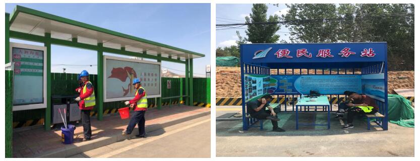 開放性施工 ?集團公司各在建項目均配備灑水車、清掃車及時進行清掃保潔,增設高強霧炮及噴淋裝置,并通過設立便民服務站、公交車等候車站、可視化圍擋等方式,讓市民能夠親身體驗精細化施工,近距離感受文明施工,全面了解最文明、最環(huán)保、最便民樣板工程。